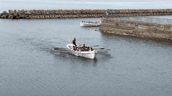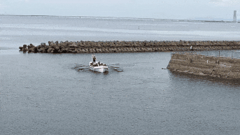 カッター体験のようすです。みんなで力を合わせて漕いでいます。