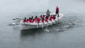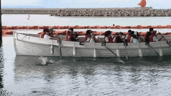 カッター体験のようすです。みんなで力を合わせて漕いでいます。