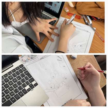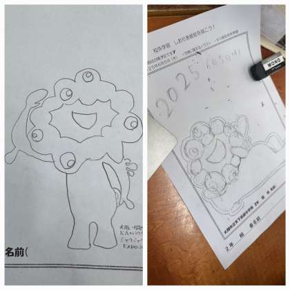 来月に行く万博校外学習へ向けて、しおりの表紙を描いています。上手にみゃくみゃくを描いてくれていますね。