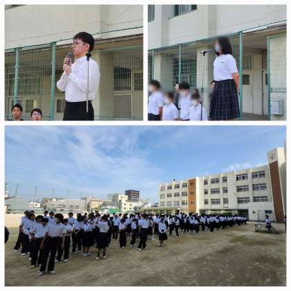 本日は朝から全校集会を行いました。校長先生から昨日行われた西成区制100周年記念式典で本校吹奏楽部が立派な発表をし、会場の皆さんを感動させてくれたお話をしました。また、今日から3週間教育実習として本校で学ぶ実習生の紹介をしました。
