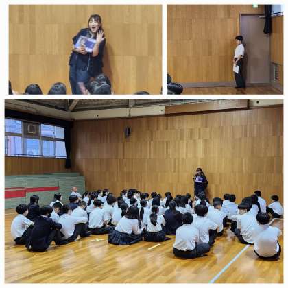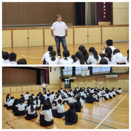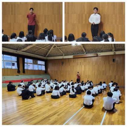 本日は朝から1年生と2年生が学年集会を行いました。1年生では一泊移住での経験をいかして来週の万博校外学習での班活動など意識してがんばってほしいとのお話がありました。2年生では教育実習生からのあいさつと担当の先生からプライベートのエピソードを交えて楽しいお話をしてくれていました。