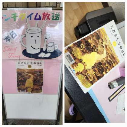 6/4のお昼にランチタイム放送を行いました。マックスボリガー作の「こどもたちのはし」の朗読でした。対岸の町がいい暮らしをしているのではないかと大人たちがいがみ合っているところをこどもたちが仲良くなりやがて橋がかかって2つの町全体が仲良くなるというお話です。また興味のある人は図書室に借りにきてください。