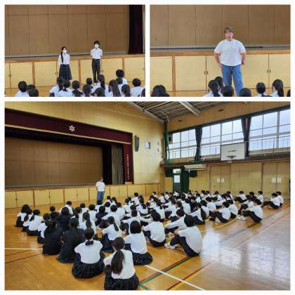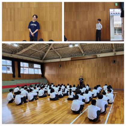本日は朝から1年生と2年生が学年集会を行いました。1年生では一泊移住の体験を通して仲間づくりや班活動について学びましたが、その経験を生かして今週木曜日の万博校外学習に臨んでほしいとのお話がありました。2年生では担当の先生から自身の友人のことをお話してくれていました。