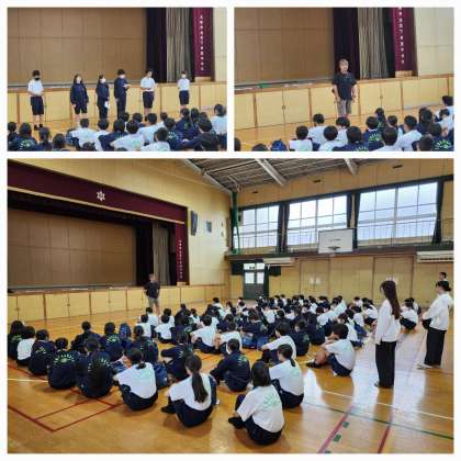 1年生が万博校外学習に行きます。出発式のようすです。各クラスの代表の人がクラスごとの目標を発表してくれました。頑張りましょう。
