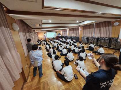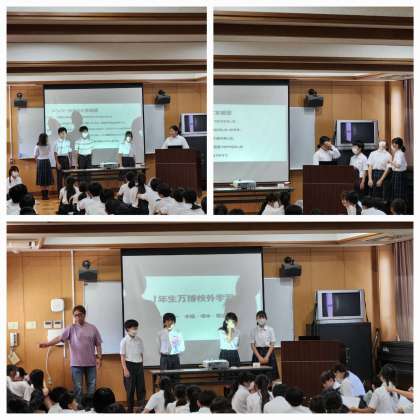 1年生が班ごとに万博校外学習に行ったときの報告会を行っていました。各班ごとに特色のある発表をしてくれていました。