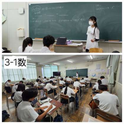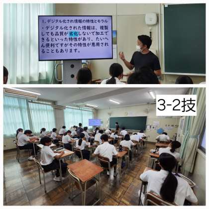 3年1組と2組の授業のようすです。数学では問題をみてどの解法で因数分解をするかを判断しながら解く練習をしていました。技術では著作権、個人情報など情報モラルについての学習をしていました。