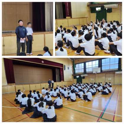 本日は朝から1年生が学年集会を行いました。1年生では担当の先生からお話がありました。昨日ブルーインパルスの飛行をみた人という質問にたくさんの人が手を上げていました。6人の飛行士の中で大阪出身のパイロットの方がいて、その方は15才の頃からブルーインパルスのパイロットになりたいと夢をみて、実現させたそうです。また自身が中学生の頃から野球をしていたけれど好きな野球にもっと打ち込んでいたらよかったと後悔しているそうです。皆さんにも今夢があると思いますので、その実現のために今できることを考えて行動してほしいと伝えてくれていました。