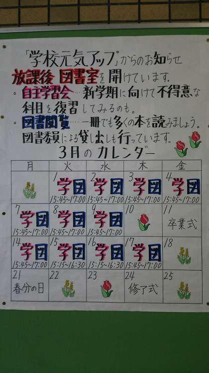 元気アップの3月の予定表が掲示されました。今月も、たくさんの学習会や図書館開放が行われています。生徒の皆さんは、どんどん利用してくださいね。