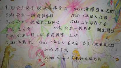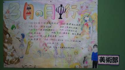 美術部による3月予定表が中央階段の踊り場に掲示されました。今月は、春の近づきを強く感じさせてくれる作品になりました。
