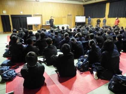 本日は、公立高等学校一般選抜があり、3年生全員がそろうことができませんでした。そこで、午後5時より「卒業証書授与式前日登校」を行い、最後の学年集会を行うとともに、明日の授与式に向けて気持ちを一つにしました。
