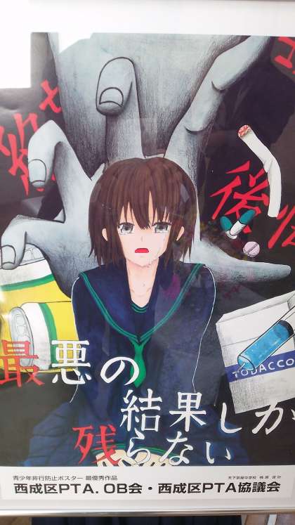 西成区PTA OB会・西成区PTA協議会主催の「青少年非行防止ポスター」選考会において、本校の桃原杏叶さんの作品が最優秀賞に選ばれました。このポスターは1000枚印刷され、西成区内各所に掲示されます。