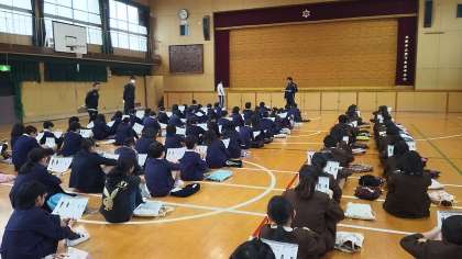 平成28年度新入生を対象に、入学前登校を実施しました。この行事は、新入生が違和感なく中学生としての学校生活をスタートできるように、と行ったものです。国語と算数の簡単なテストを行った後、校長と生徒指導主事から、中学校生活についての話をしました。