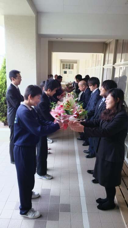 3月31日、平成27年度末をもって異動する教職員の離任式を行いました。PTA実行委員さんの企画により、離任される教職員に、子どもたちからきれいな花束が贈呈されました。たくさんの卒業生も集まってくれました。