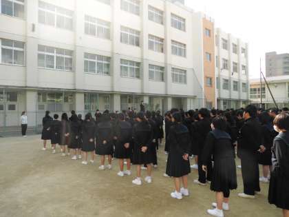 本日の全校集会のようすです。新着任の教員の紹介の後、学校長より、よりよい人間関係の構築についての講話がありました。その後、生徒会の代表より、「3年生がしっかり手本を示して、よい学校をつくっていこう」という話がありました。