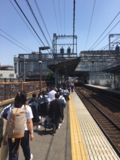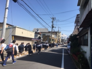 13時56分、JR信太山駅到着。本日宿泊する「信太山野外活動センター」までは、徒歩で30分ほどです。気温がぐっと上がってきました。みんな頑張ろう!