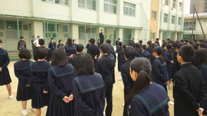 本日の全校集会のようすです。学校長からは、学んだことを実践していこうという講話がありました。その後、生徒指導主事から、学校生活についての話がありました。最後に、生徒会役員より、スマホ依存症にならないように注意を促す話がありました。