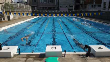 水泳部では本日が初泳ぎになりました。午後から水温も上がり、泳ぐにはよいコンディションでした。初泳ぎということもあり、本日は「100mを20本」という軽いメニューでした。