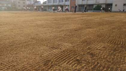 体育大会に向けて、明日は運動場ににがりをまきます。その下準備として、野球部、サッカー部、陸上部で運動場の整地をしました。
