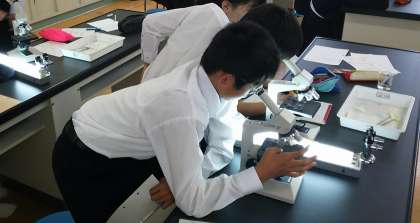 2年生の理科授業のようすです。本日は、植物の細胞観察をしました。特殊な染色液で、細胞の核を染めて観察しました。きれいに観察でき、驚きの声があがっていました。