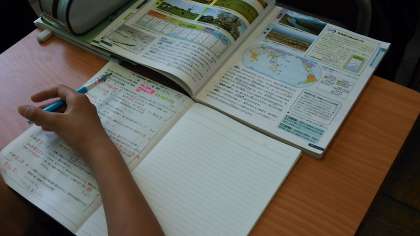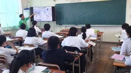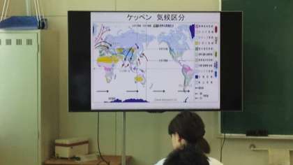 1年生の社会の授業のようすです。本日は映像資料を使いながら、世界の気候について学びました。映像資料を効果的に活用することで、理解の促進につながります。