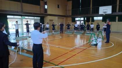 消防署の方からロープの結び方を教えていただいているところです。ロープの結び方にはさまざまな種類があり、子どもたちは、難しい結び方にも集中して取り組んでいました。