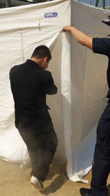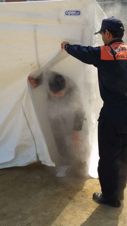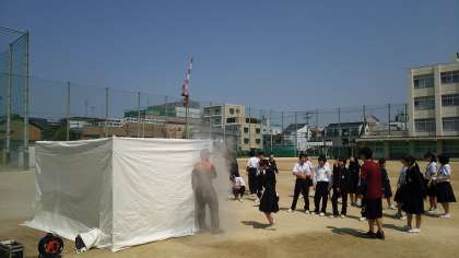スモークテント体験のようすです。火災時、煙を吸い込むことにより重大な事故につながることが往々にしてあります。安全なけむりを使い、煙の中でどのように行動すればよいかを学びました。