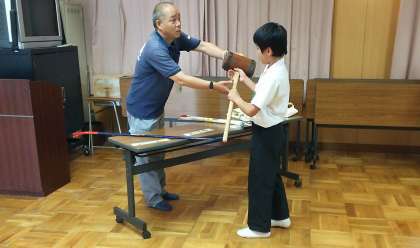 区役所の方より、人命救助のための資材の説明を受けました。その後、物干しざおと毛布を使って担架をつくり、人を搬送する訓練を行いました。
