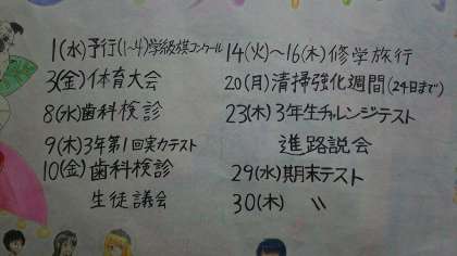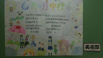 美術部作の6月の行事予定表が中央階段の踊り場に掲示されました。梅雨の季節を楽しく描いてくれました。