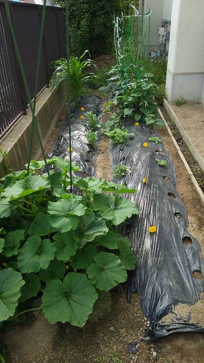 格技室の南側では、特別支援学級が野菜の栽培をしています。キュウリやニンジンやオクラなど。カボチャもどんどん成長し、黄色い花をつけました。