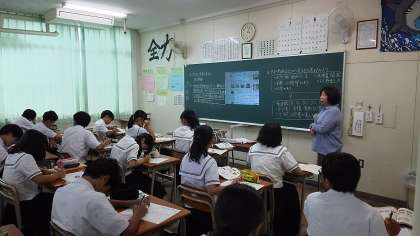 3年生の家庭科の授業のようすです。食物分野の学習をしているところです。プロジェクターで、さまざなな資料を投影し、理解の促進を図っています。