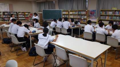 月に一度、生徒委員会を実施し、学校の諸問題をとりあげ、それに対する解決策などを話し合っています。写真は、図書委員会のようすです。今月の話し合いでは、図書室利用の促進について話し合いました。