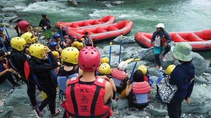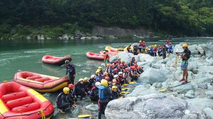 気温は30℃を超えていると思われます。まさにラフティング日和!さまざまな危険を想定しての、事前確認をしているところです。