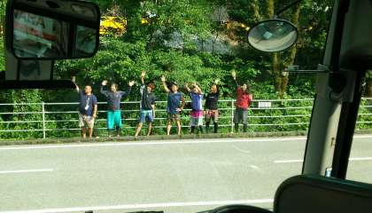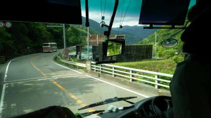 ラフティングスタッフの温かいお見送りを受け、本日の宿舎「ホテル秘境の湯」に向けて出発しました。つづら折れの山道をバスは行きます。