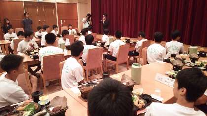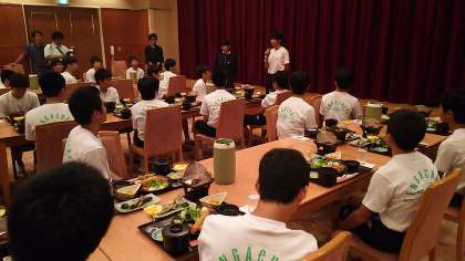 ラフティングをしましたので、ホテル到着後すぐにお風呂に入りました。そのため入館式を夕食前に行いました。実行委員長からの挨拶に続き、ホテルの方からの歓迎の言葉をいただきました。