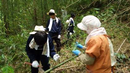 標高600m以上にある平田さん宅での民泊のようすです。裏山で山林作業をしているところでした。高所地とあって、かなり涼しかったです。