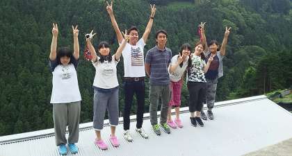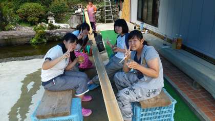 平田さん宅から標高差200m程のところにある田本さん宅でのようすです。昼食で、流し素麺を食べているところでした。庭から大きな声を出すと、山びこが返ってきました。