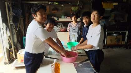 堀川さん宅での活動のようすです。写真は、こんにゃく作りをしているところです。家の前に清流が流れており、夜になると、満天の星のようにホタルが飛び交うそうです。