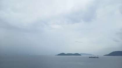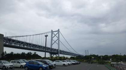 与島サービスエリアでトイレ休憩をして、倉敷に向けて瀬戸大橋を渡っています。倉敷までは約30分程度です。現在、雨はやんでいます。
