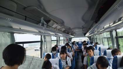 倉敷での散策を安全に楽しくするために、バス内で散策ルートなどについて再確認しています。
