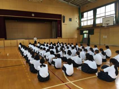 1年生の朝の学年集会のようすです。本日は、教育実習生から、1年生全員に向けてのメッセージを発信しました。大リーガーのイチロー選手の、偉業を支えているものは何かという話でした。子どもたちは、しっかりと耳を傾けて聞いていました。