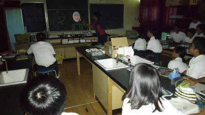 1年生理科の授業のようすです。光源装置を使い、半円形ガラスの中を光がどのように進むのかを実験によって確かめています。グループで話し合いながら、光の進み方の法則性を見つけ出していました。