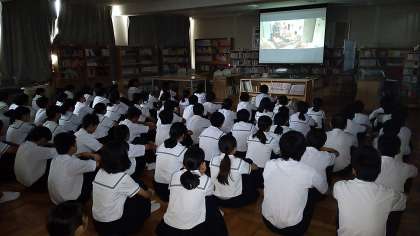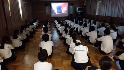 グラウンドでの黙とう後、各学年に分かれて、映像資料を使いながら平和学習をすすめました。