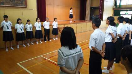 今週の全校集会のようすです。学校長の講話、生徒指導主事からの生活指導面についての話のあと、保健委員長と生徒会役員からの話がありました。生徒も、いつもながら、しっかりとした口調で話をしてくれました。