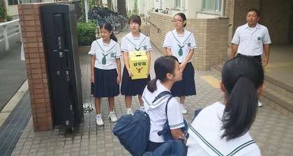本日は、生徒会役員生徒が目安箱を抱えて、あいさつ運動を行いました。この目安箱は、学校をよりよくするための提案を、全校生徒から募るものです。生徒の皆さん、学校をよくするための提案を、どんどん出してくださいね。