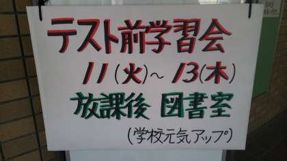 学校元気アップ活動では、ほぼ毎日自主学習や図書室開放を実施していますが、テスト前・テスト期間中には「テスト前学習会」を実施しています。昨日は、多くの生徒がボランティアさんの力を借りながら学習していました。本日と明日も実施しています。どんどん利用してください。