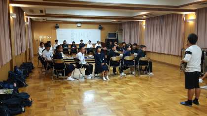 生徒会が新しい体制になって第1回目の生徒議会を開催しました。それぞれの委員会で話し合ったことを、生徒議会で報告し合いました。写真は、生徒会担当の教員からの話を聞いているところです。