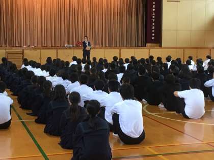 全校集会で、西成警察生活安全課の警察官の方に、防犯講話をしていただきました。犯罪被害者にならないために気をつけることや、自分自身が法律に触れることをしないようにしよう、という講話でした。生徒は真剣に聞いていました。