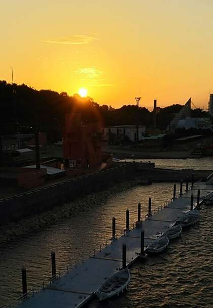 カヌーとカッターボートの乗船が終わり、各クラス交代でお風呂に入っています。夕食は、18時からです。写真は、海洋センターにから見える日の入りの情景です。