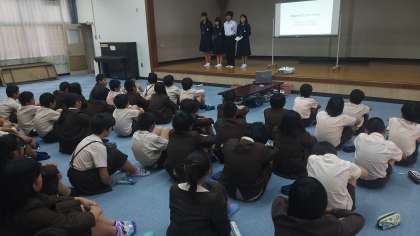 児童見学交流会に向けて、生徒会役員が天下茶屋小学校へ、事前説明にいきました。小学校6年生を対象に、プレゼンテーションソフトを使いながら、児童見学交流会当日のことなどについて話をしました。