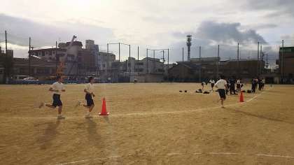 保健体育の授業のようすです。写真は長距離走をしているところです。「人生は行距離走」を合言葉に、長距離走が得意な生徒も苦手な生徒も、全力で頑張っています。